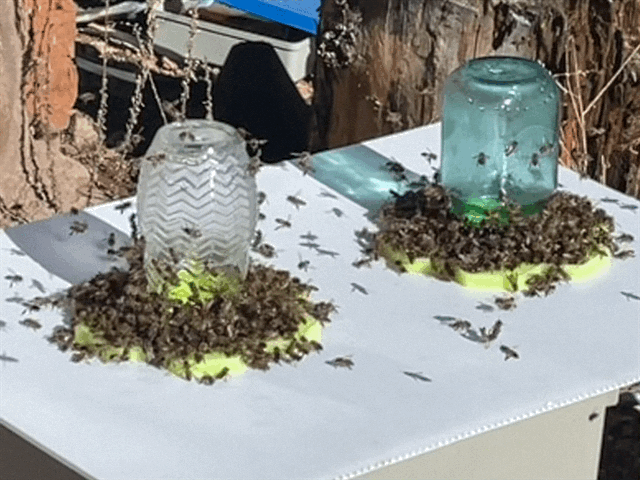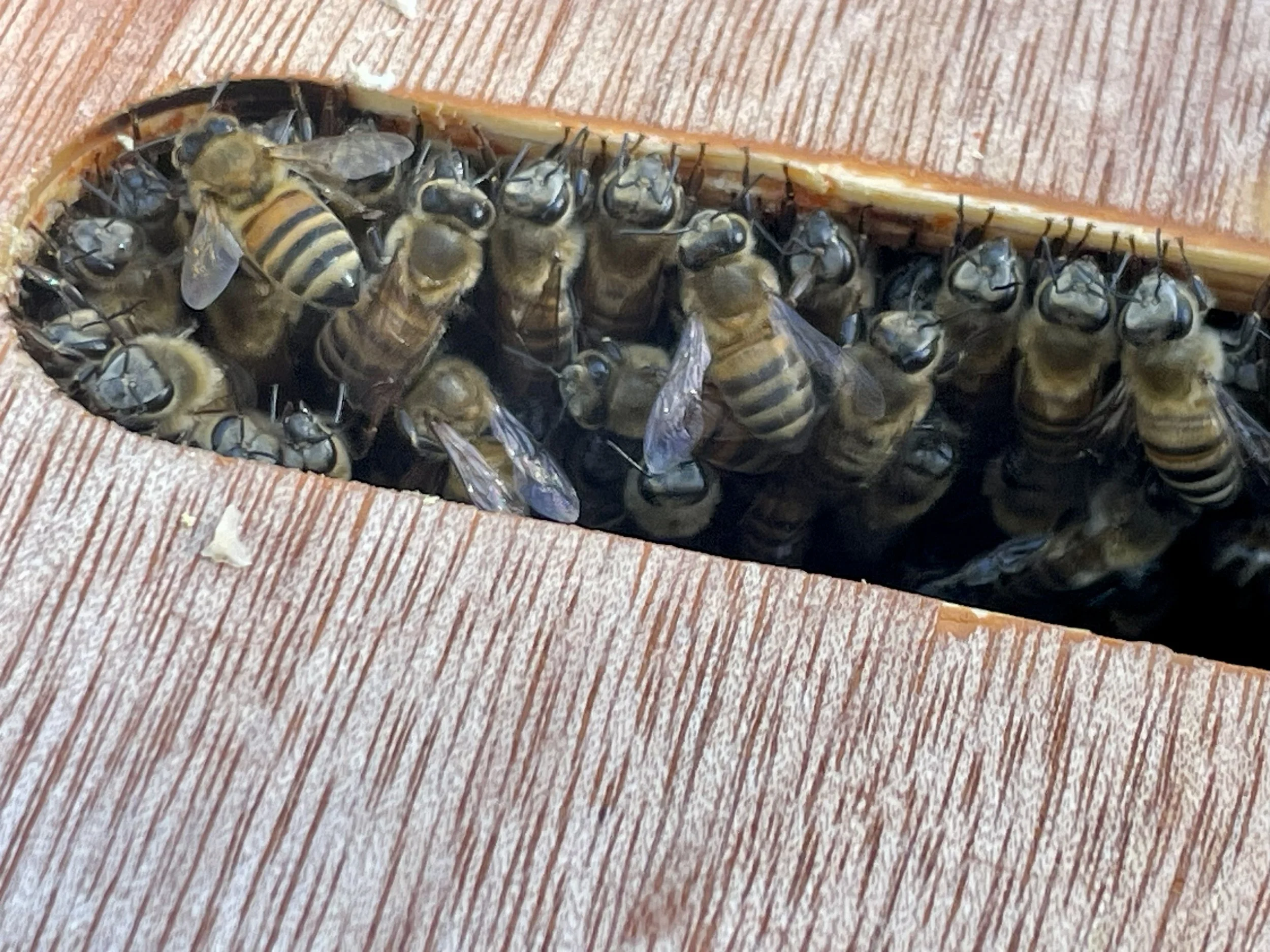 Other observations: Bees flying to and from external sugar syrup source 15’ away. They ignore beekeeper and any other person or movement. After speaking with beekeeper about consistent gentle behavior, this colony may be EHB from a late summer swarm from a colony of another beekeeper in the area.