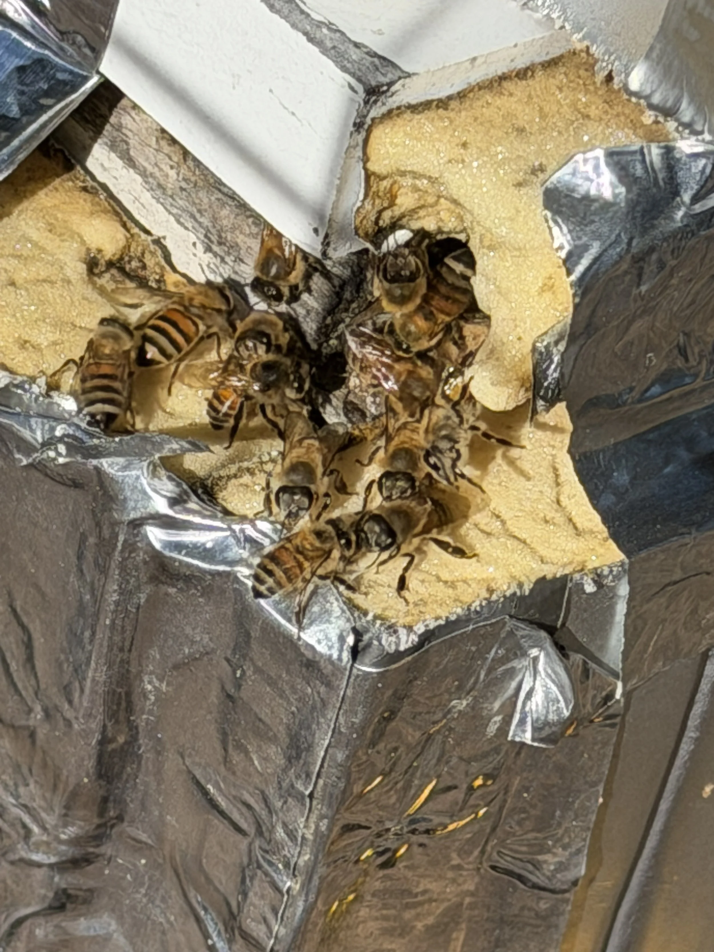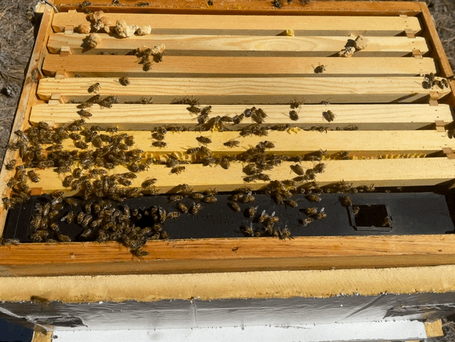 Where are bees now: Bees are kept in 2 deep 10 frame Langstroth boxed dead out hive with previous comb. Insulation was added surrounding outside walls and the top of hive. Small 2” entrance on the bottom right of hive boxes. Internal condensation/temperature not monitored.